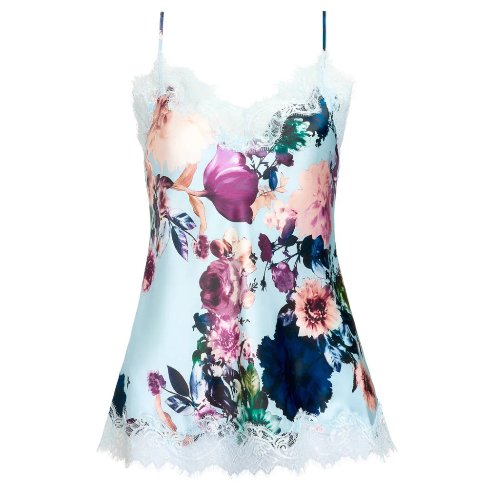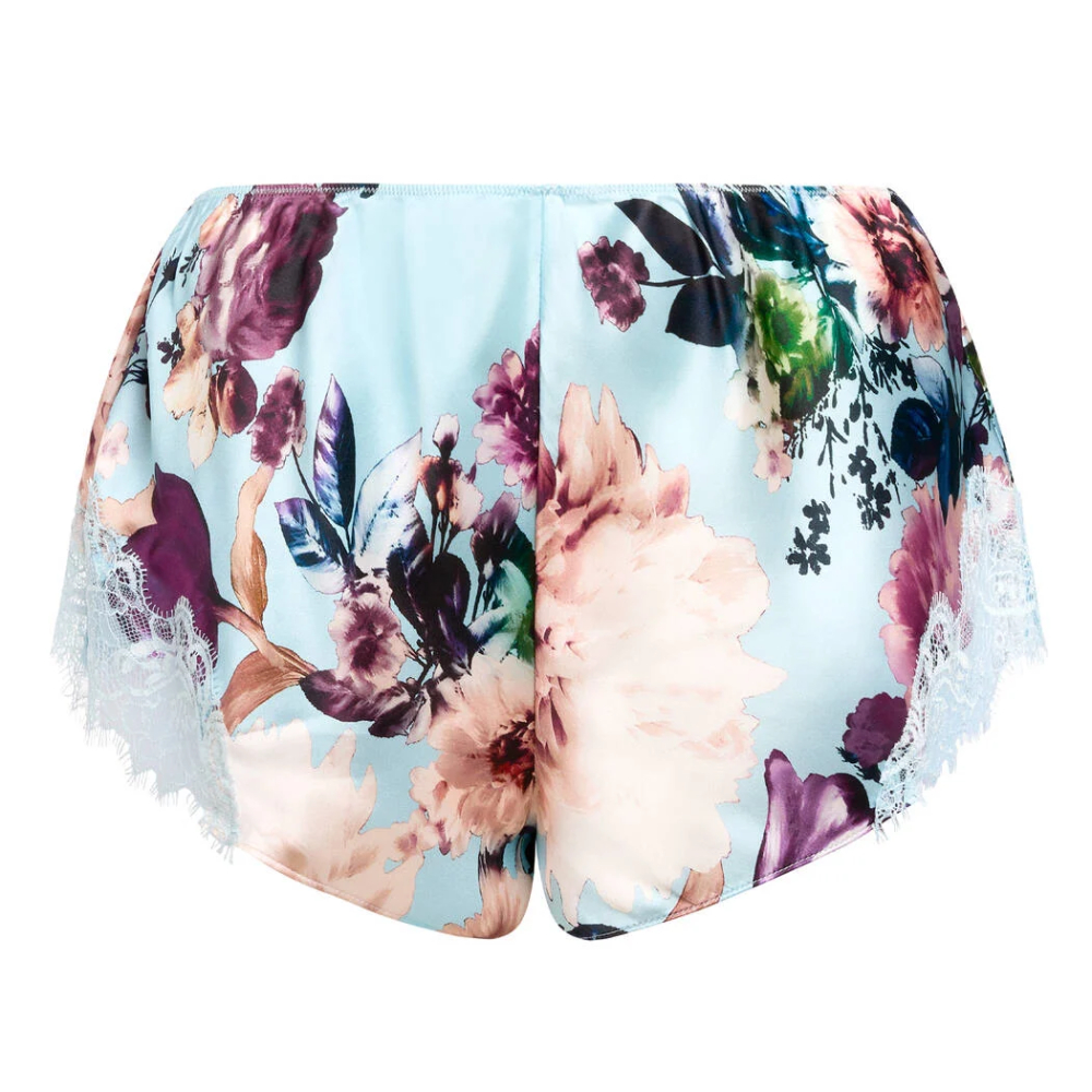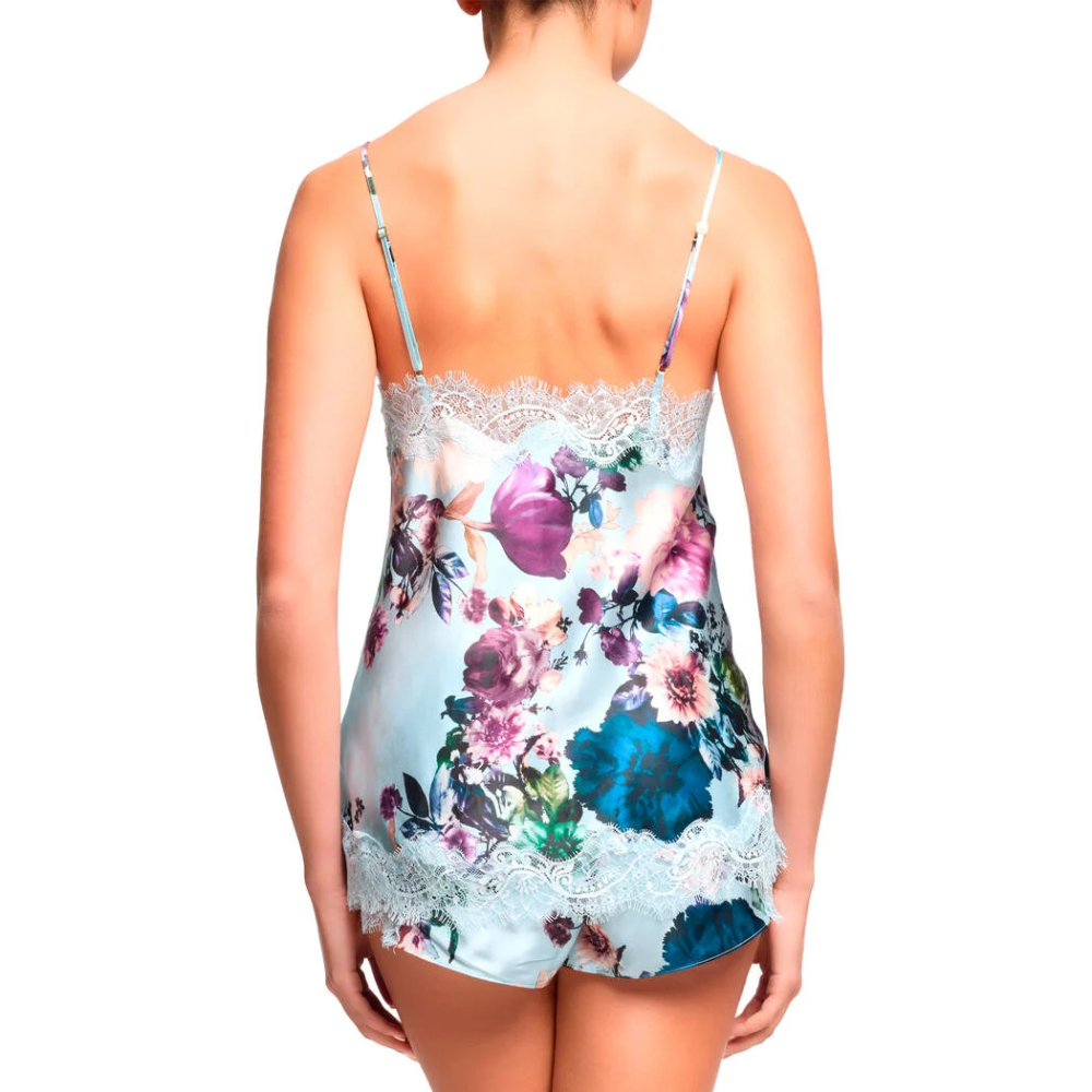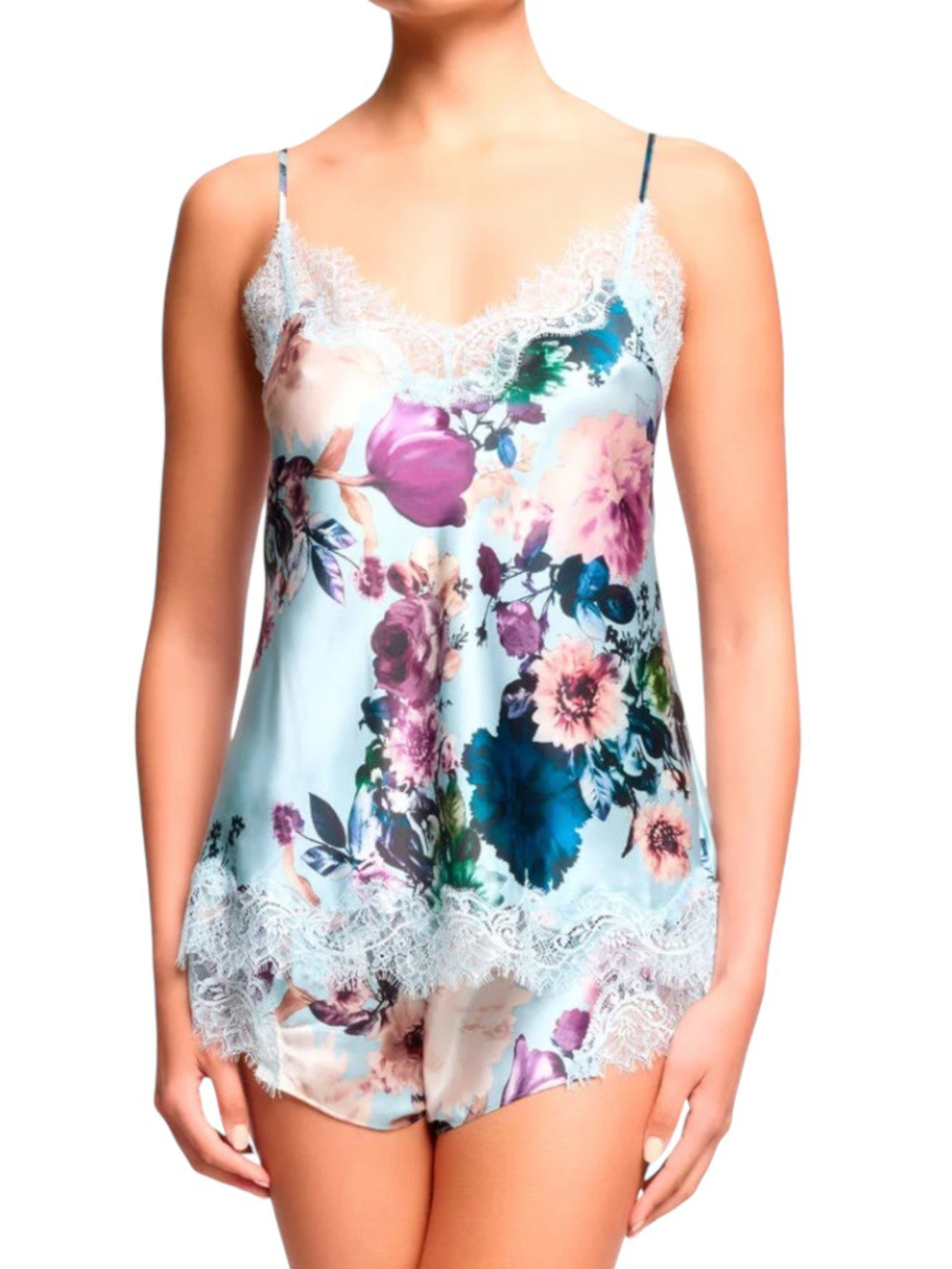 Комплект изготовленный из красивого атласного шелка с нежнейшим цветочным принтом, отделан красивым цветочным кружевом.