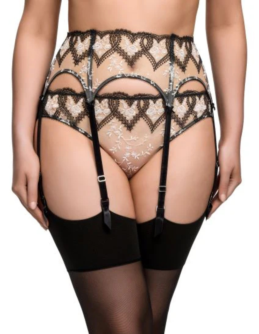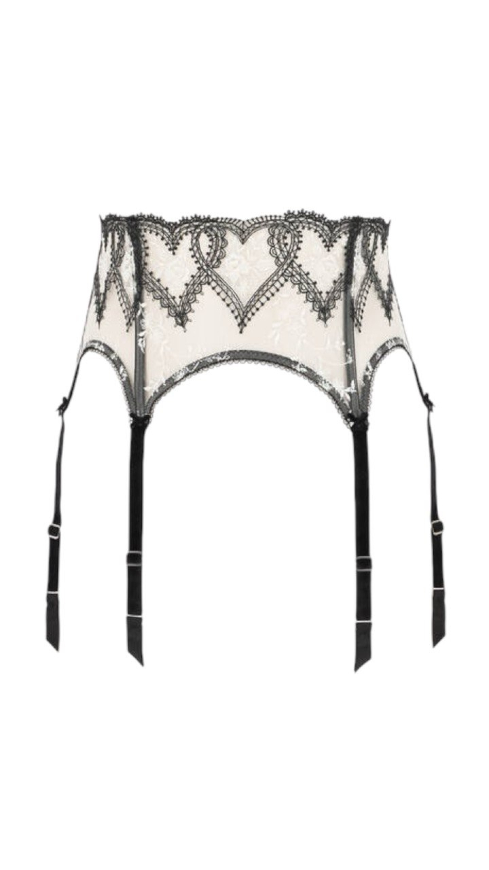Красиво вышитые сердца и цветы, Дита назвала эту коллекцию Lovella! Черная вышивка на белом тюле создает сказочный контраст. Подтяжки Lovella имеют полностью вышитый перед с шестью подвязками для чулок для устойчивости и функциональности.