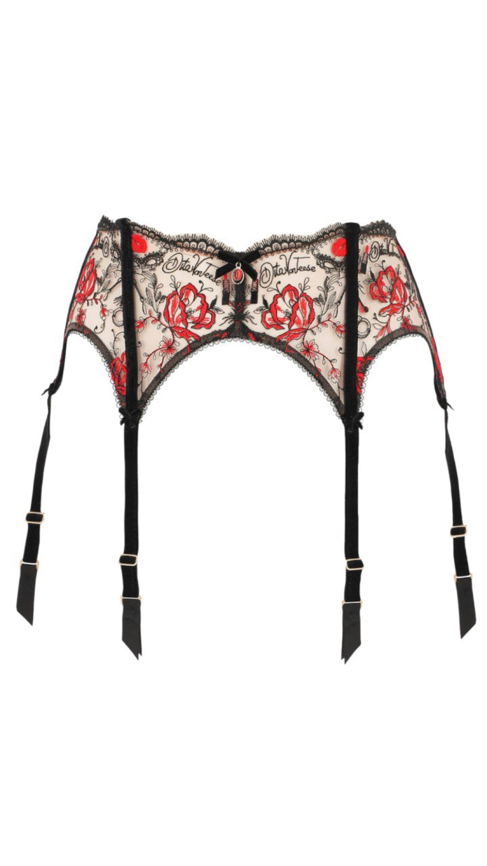 Dita вывела свое искусство «Teese» на новый уровень с помощью элегантно-веселой коллекции Novelteese. Эта красивая красно-черная вышивка на сетке иллюзии представляет собой маленькие сувениры Dita. Ее подпись, ее поцелуй, дерзкий хлыст и наручники, соблазнительная маска для глаз, шпильки и рубиново-красная помада. Сможете ли вы найти их все? Подтяжки Novelteese — это коллекционный экземпляр! Разработаны так, чтобы сидеть высоко на талии, с мягкими косточками, обтянутыми бархатом для придания формы. Эти подтяжки украшены культовой вышивкой Ditas с акцентами на бархатных линиях дизайна и имеют 6 креплений для подвязок для устойчивости.